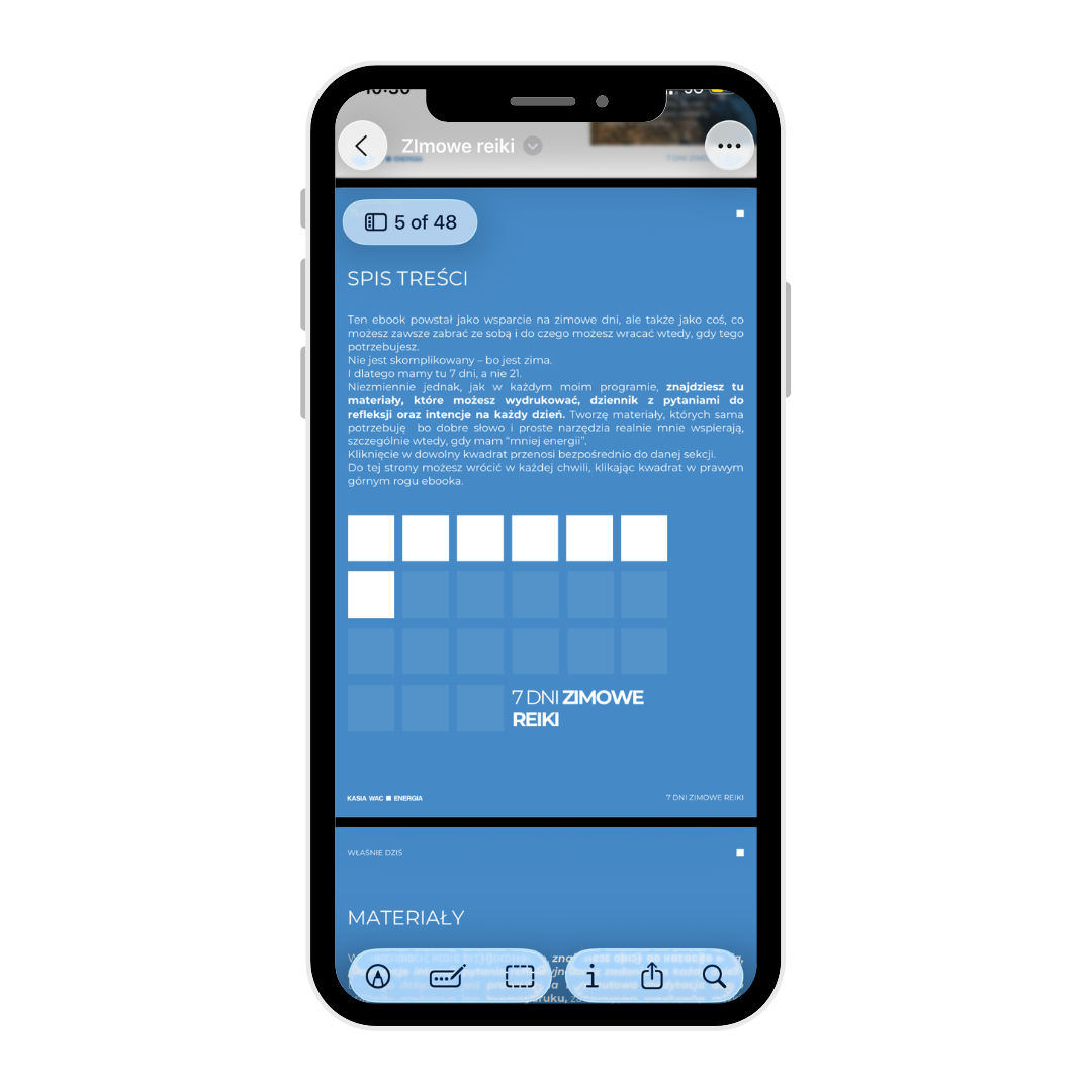 Program opiera się na codziennej, 15-minutowej praktyce, prostych medytacjach, refleksjach inspirowanych Gokai oraz pracy z ciałem, oddechem i uważnością. W ramach programu znajdziesz prowadzone medytacje audio, codzienne intencje i refleksje, zadania wspierające regulację i odpoczynek oraz praktykę w bezruchu i w ruchu, w tym spacer z Reiki. Przygotowałam także materiały do druku – karty praktyki i przestrzeń dziennika – oraz eBook, który prowadzi przez cały proces. Celem tej praktyki jest wsparcie w integrowaniu Reiki w codziennym życiu, w rytmie zimy, bez presji i bez przyspieszania. To program doświadczenia i praktyki, a nie kurs Reiki ani proces inicjacji.